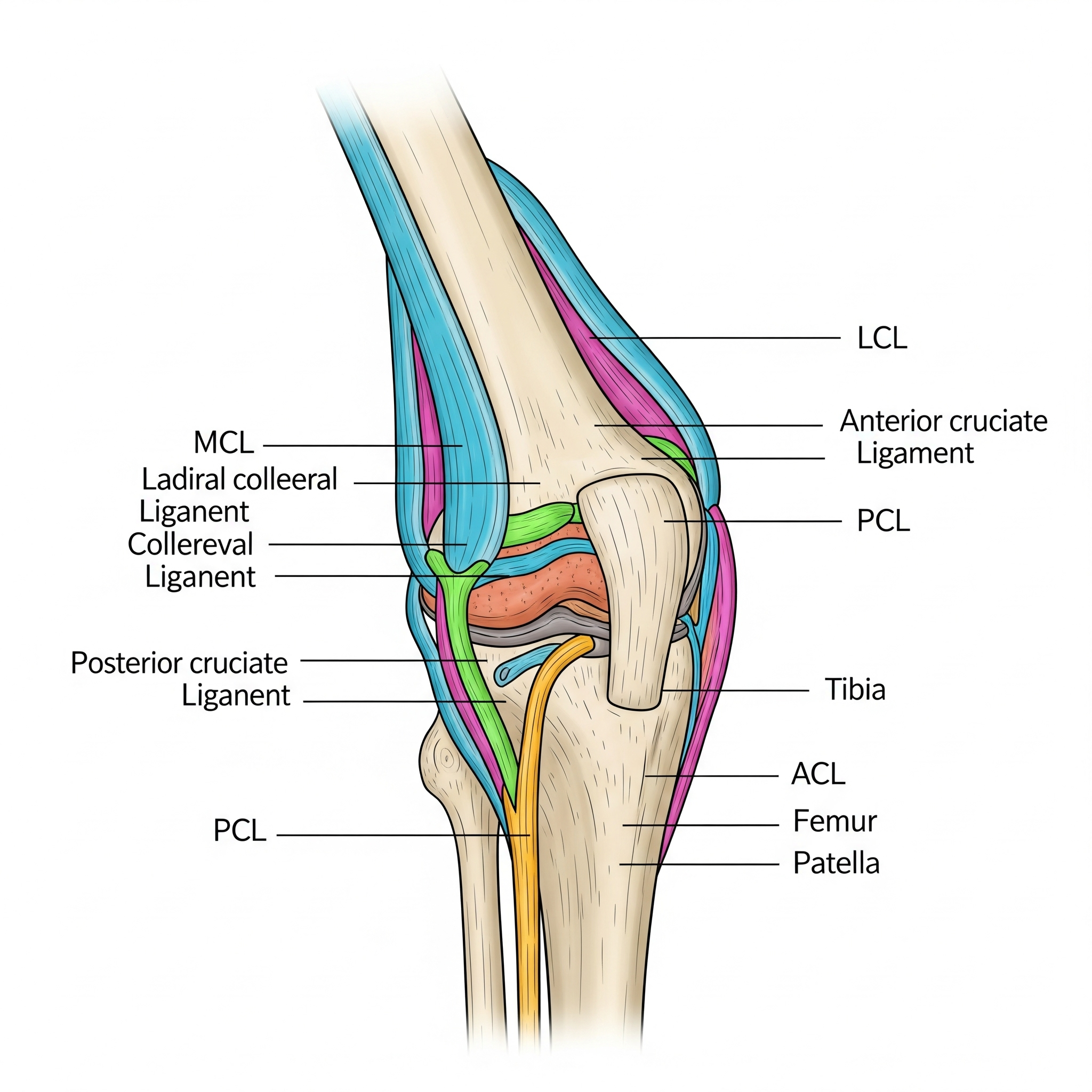 무릎 염좌는 우리 몸에서 가장 크고 복잡한 관절 중 하나인 무릎을 지탱하는 인대가 손상되는 것을 의미합니다. 여기서 인대(Ligament)란 뼈와 뼈를 연결하여 관절의 안정성을 유지하고 움직임을 제한하는 강한 섬유 조직 띠를 말합니다. 무릎에는 여러 중요한 인대들이 있으며, 이들이 손상되는 정도에 따라 염좌의 심각도가 달라집니다.