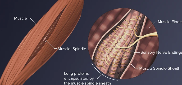 (2) 근육의 신경 섬유는 근방추가 늘어나는 정도와 속도에 대한 정보를 전달합니다.