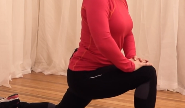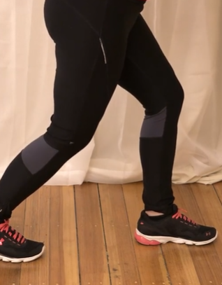 -스트레칭 하려는 반대쪽 다리의 무릎을 구부린 채 다리를 약간 앞으로 내딛고, 스트레칭 하려는 다리는 곧게 펴고