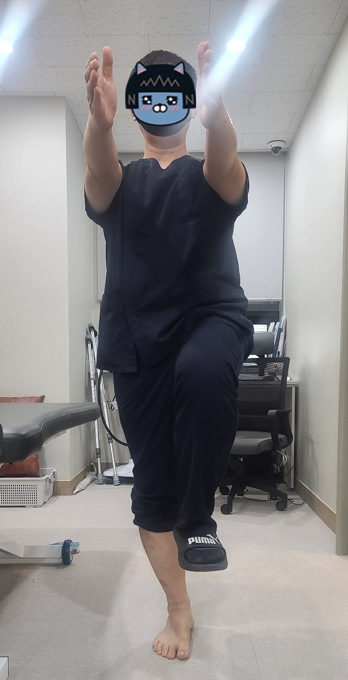 정면을 본 상태에서 버티기가 수월해지면 한발 선 상태에서 앞으로 나란히 하신후몸통을 좌우로 회전하는 동작까지