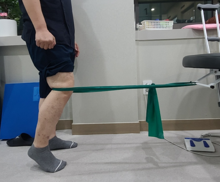 탄력밴드가 탄성이 생기는 위치까지 뒤로 갑니다. 그 다음 수술한 다리의 뒤꿈치를 천천히 들어주면서