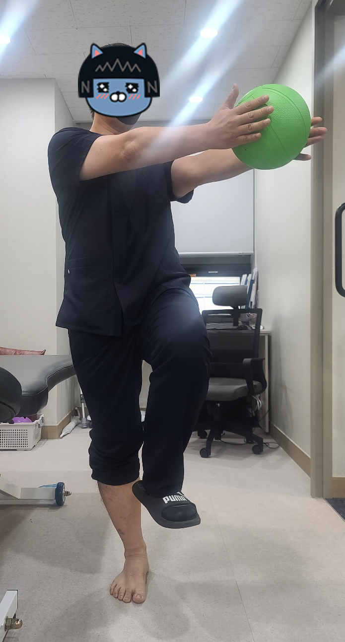 정면을 본 상태에서 버티기가 수월해지면 한발 선 상태에서 앞으로 나란히 하신후몸통을 좌우로 회전하는 동작까지