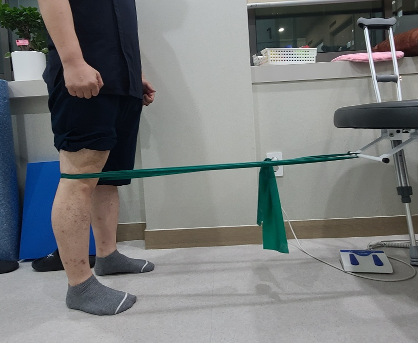 탄력밴드가 탄성이 생기는 위치까지 뒤로 갑니다. 그 다음 수술한 다리의 뒤꿈치를 천천히 들어주면서
