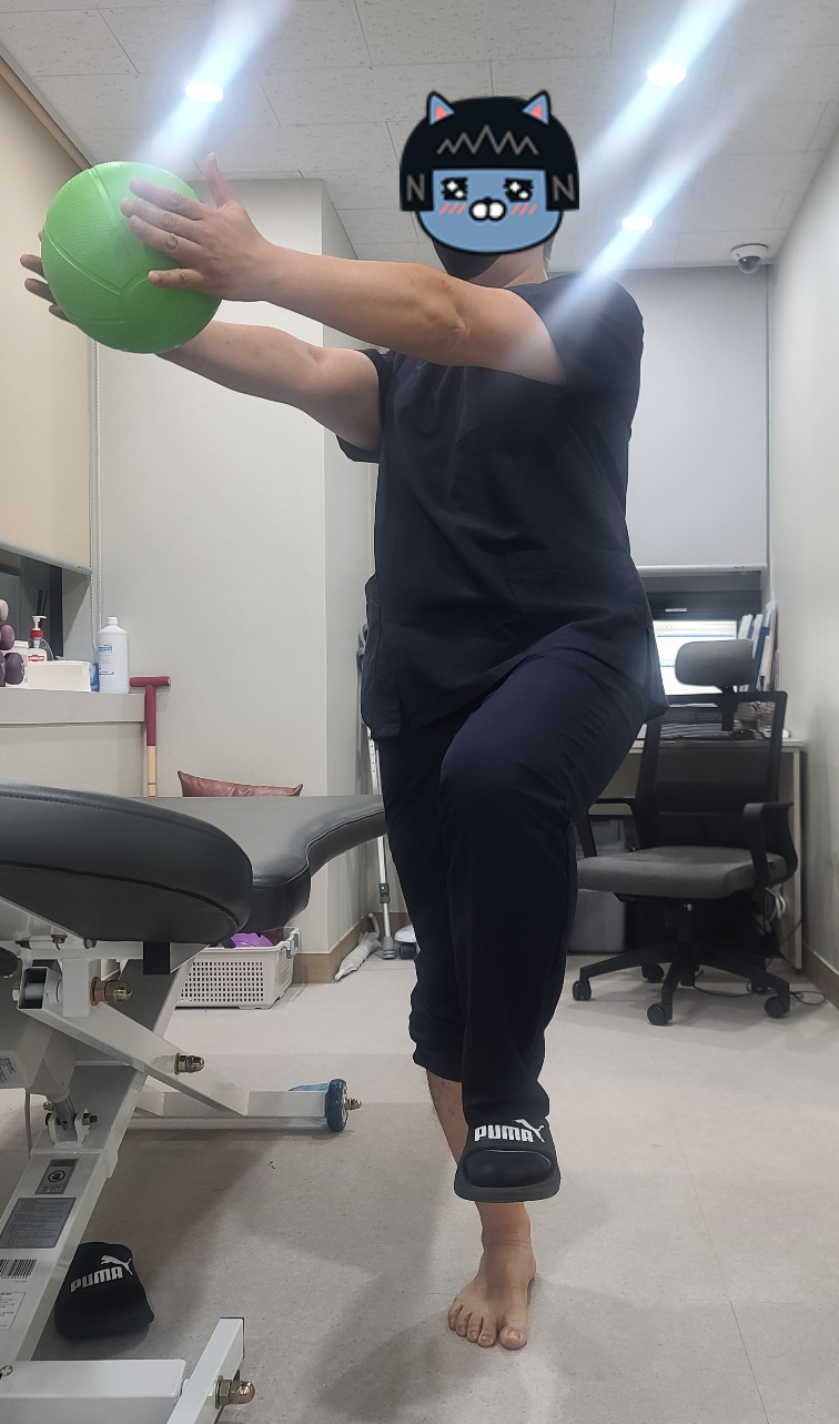 추가로 다리를 구부린 상태에서 앞으로 나란히 하시고 몸통을 좌.우로 회전하는 동작까지 추가로 해주시면 더욱