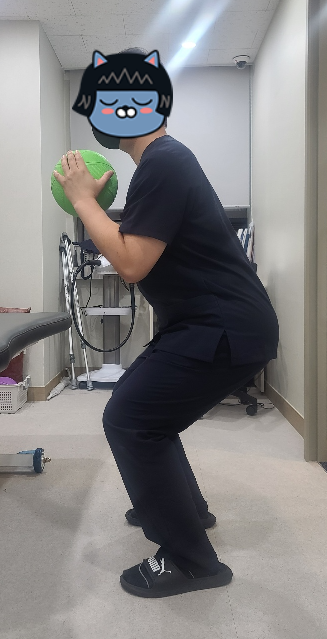 처음에는 통증체크 및 좌우 밸런스를 잡기 위해 미니스쿼트 부터 실시 합니다.