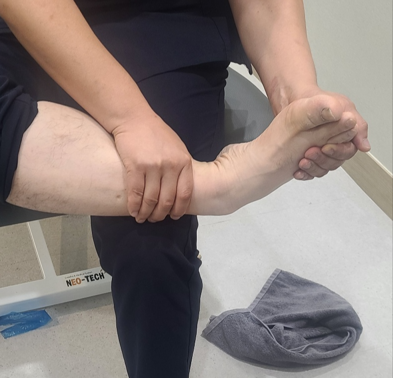 저측굴곡 가동범위 체크방법은 다리를 뻗고 앉은 상태에서 수술한 반대쪽 발목을 같이 내려서