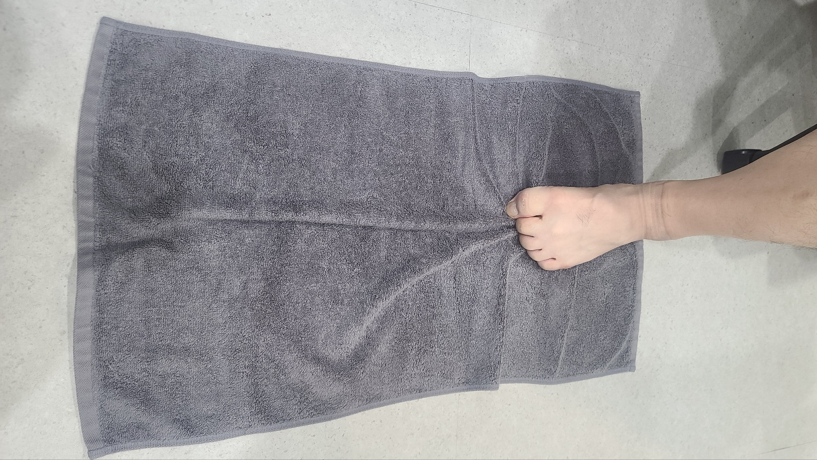 발가락으로 수건을 잡으면서 수건을 점점 당기는 운동입니다. 처음에는 발가락에 힘이 없어서 생각보다 수건을