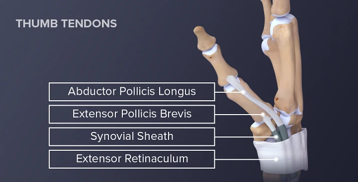 힘줄은 뼈를 근육에 연결하여 움직임을 강화합니다. 엄지손가락은 다른 손가락과 독립적으로 움직이고 집거나 잡는 등의 동작을 수행술 수 있는 독특한 힘줄이 있습니다. 대부분 과사용으로 인해 염증은 힘줄(건염) 또는 힘줄을 감싸고 보호하는 활막(건초염)에 영향을 미칠 수 있습니다. 엄지손가락에 있는 두 개의 힘줄이(Abductor Pollicis Longus, Extensor Pollicis Brevis) 이 엄지손가락 뒤쪽 위로 나란히 뻗어 있습니다. 이러한 힘줄 및 윤활막에 염증이 발생하면 힘줄은 신근 망막(Extensor Retinaculum) 이라고 알려진 근막 밴드 아래로 더 이상 쉽게 미끄러질 수 없습니다. 이 염증이 만성화 되면 손목건초염 으로 진단될 수 있습니다.