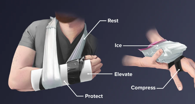 - 거상(Elevation): 손목을 심장보다 높은 위치에 두어 손상된 부위에 혈액이 고이는 것을 방지합니다.