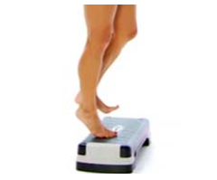 ▶ 발꿈치를 조심스럽게 계단 높이 아래로 내려 스트레칭이 느껴질 때까지