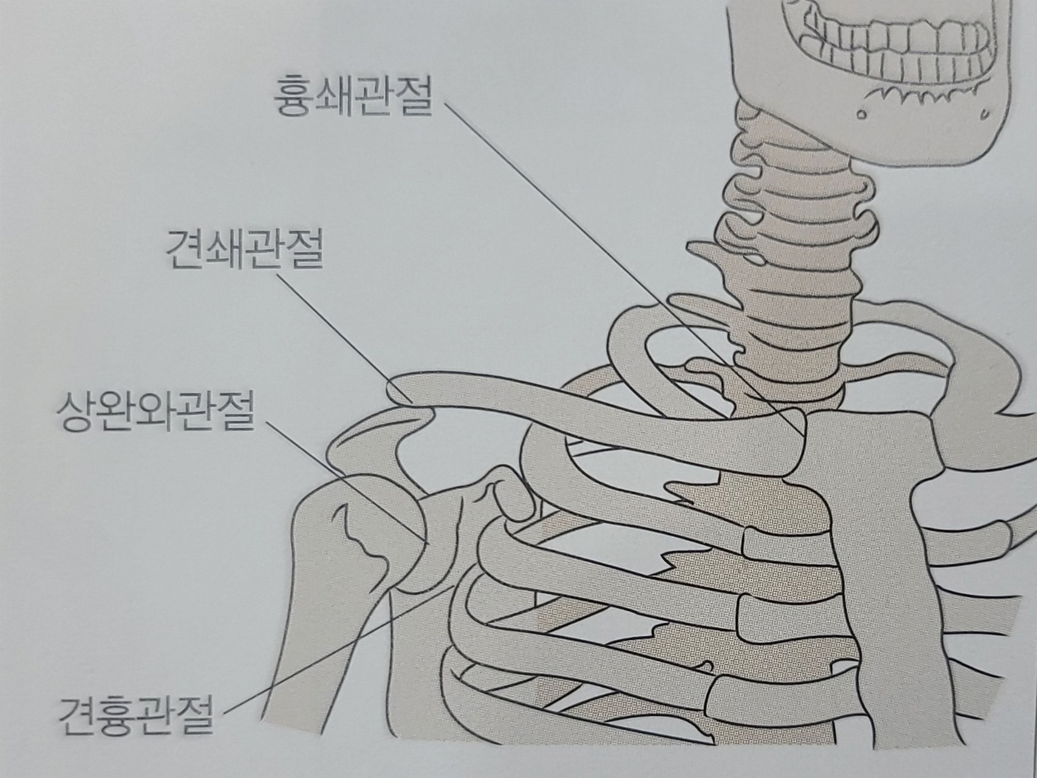 어깨는 상완와관절, 견흉관절, 견쇄관절, 흉쇄관절로 이루어져 있습니다. 어깨의 움직임은 이들
