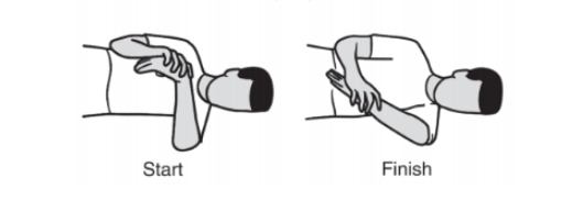 - 어깨 뒤쪽 조직을 늘리기 위한 가벼운 슬리퍼 스트레치(sleeper stretch) 수행