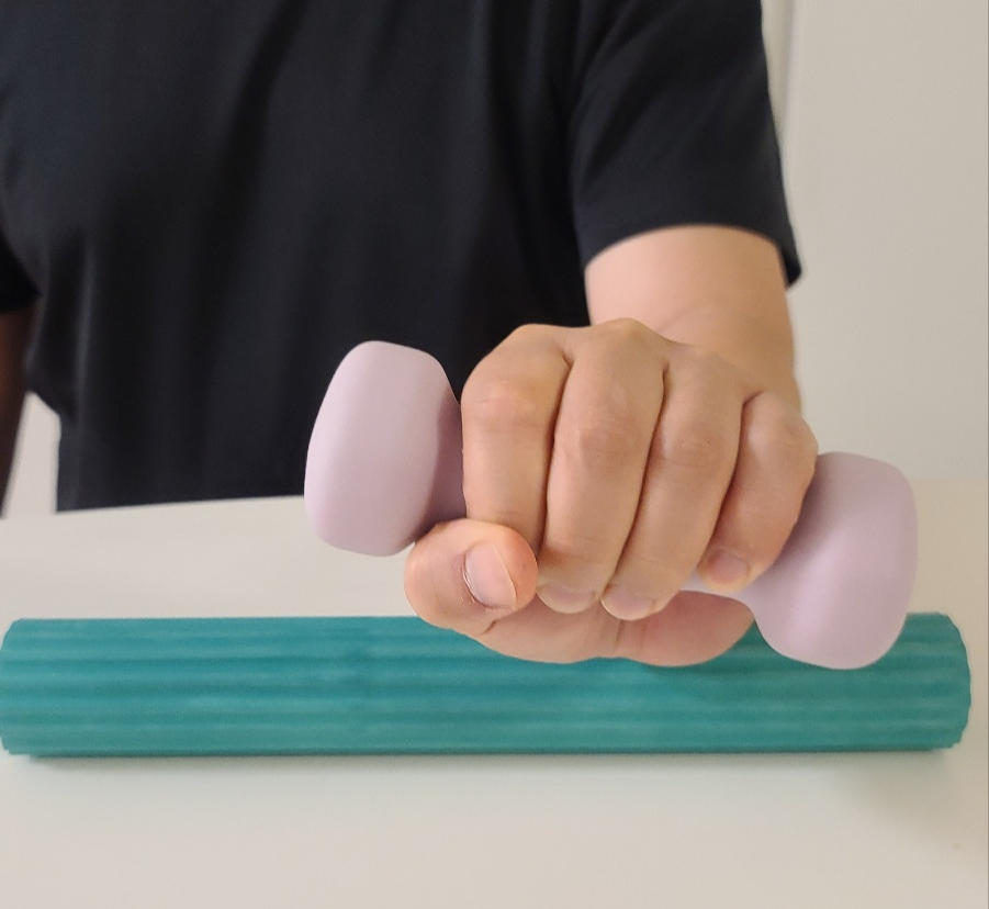 아령이나, 탄력밴드를 잡고 손목의 굴곡, 신전운동을 하시면 됩니다.