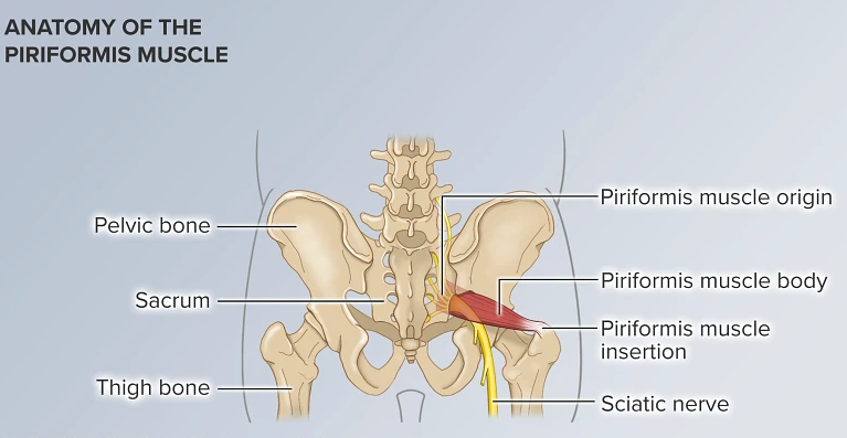 천골 앞쪽에서 기시하여 골반을 가로질러 대퇴골의 대전자에 정지합니다.