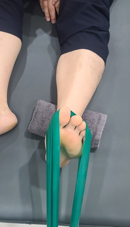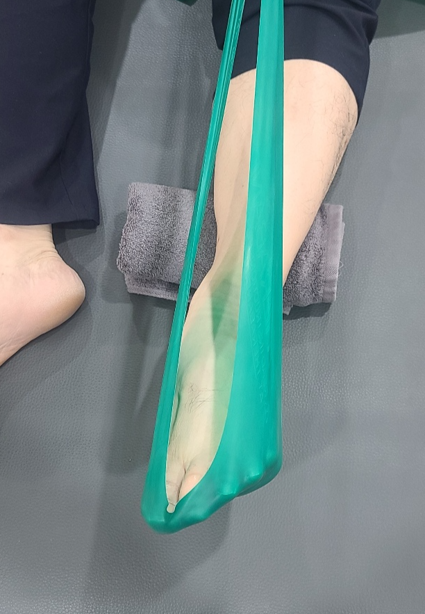 탄력밴드를 발바닥에 걸고(발가락도 같이 덮음) 종아리 근육이 수축될수 있도록 밀어줍니다.