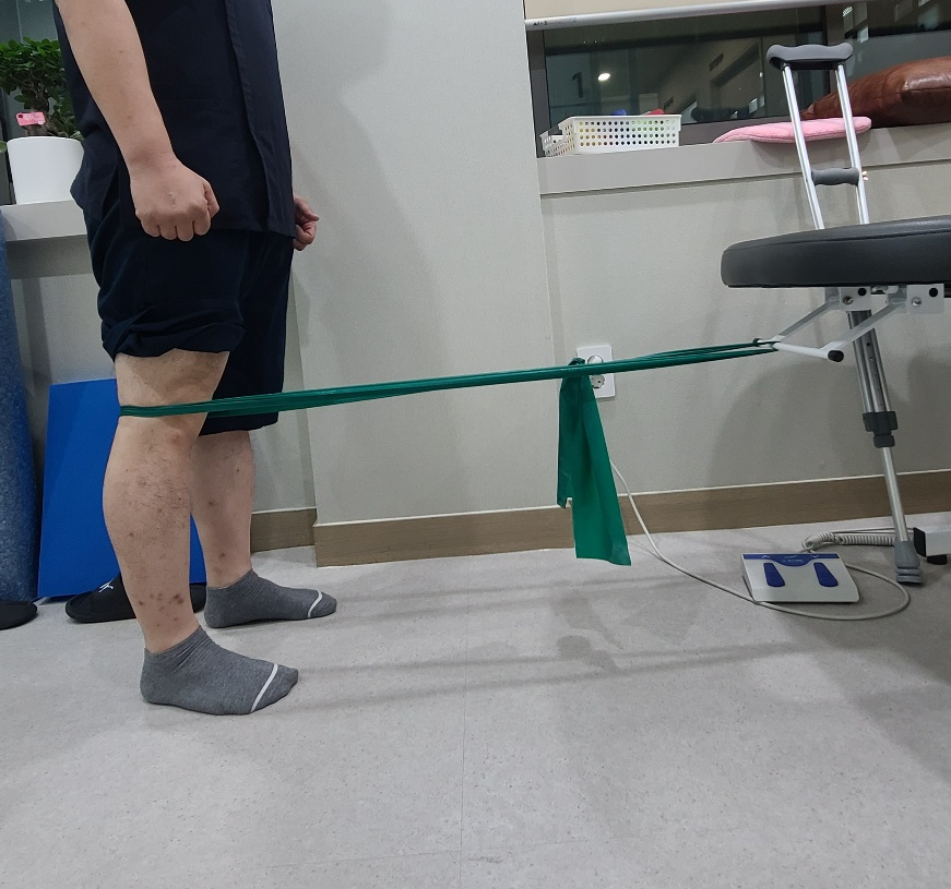 다시 뒤꿈치를바닥에 놓으면서 허벅지에 힘을주고 무릎을 신전시켜 줍니다. 이때 밴드 탄성으로