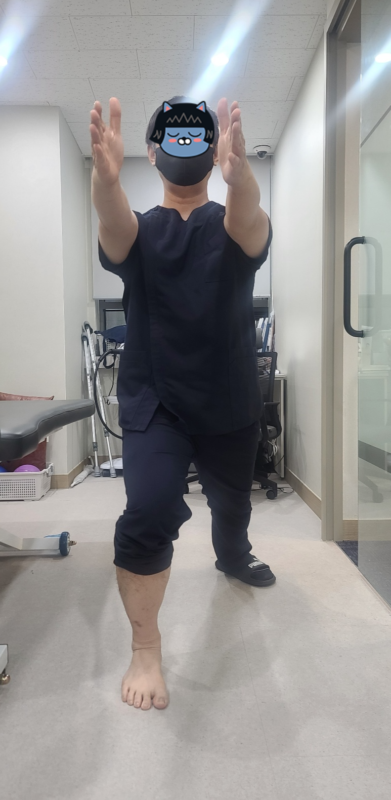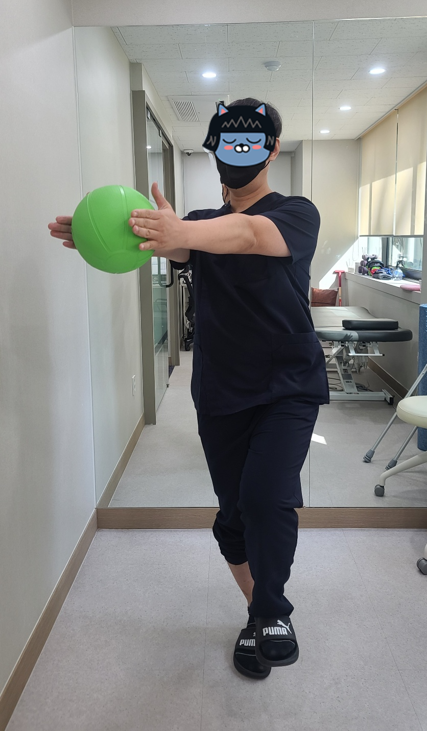 하시면 됩니다. 가급적이면 거울을 보시면서 몸이 수술한 반대쪽으로 치우치지 않도록 주의해주세요.
