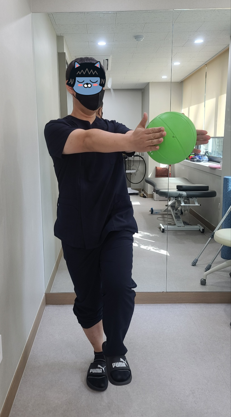 그리고 한발로 서있기가 조금 편해지시면 몸통회전도 같이 하시면 좋습니다.