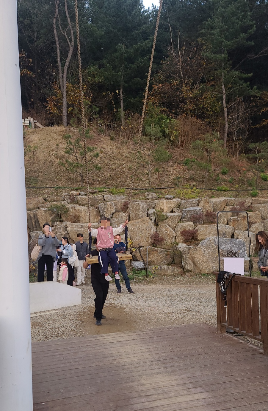 줄이 엄청 긴 그네인데 뒤에서 밀어주시는 분들이 있어요 .