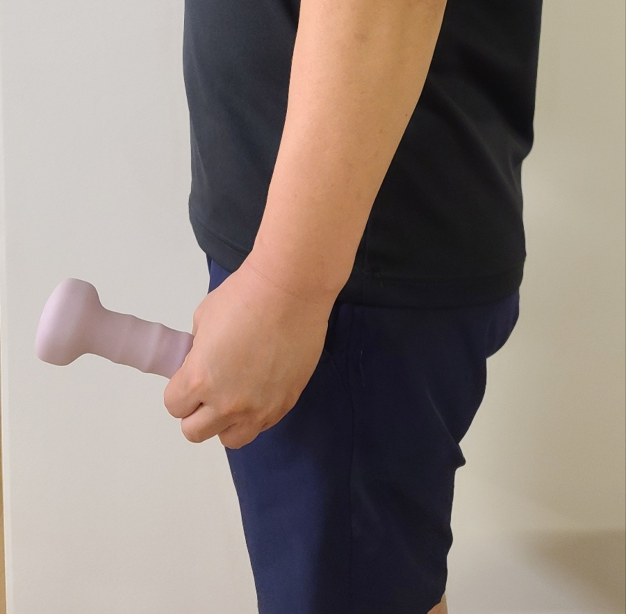 팔을 밑으로 편 상태에서 아령 또는 물병 같은 도구를 앞을 향하게 잡은 후 바닥쪽으로