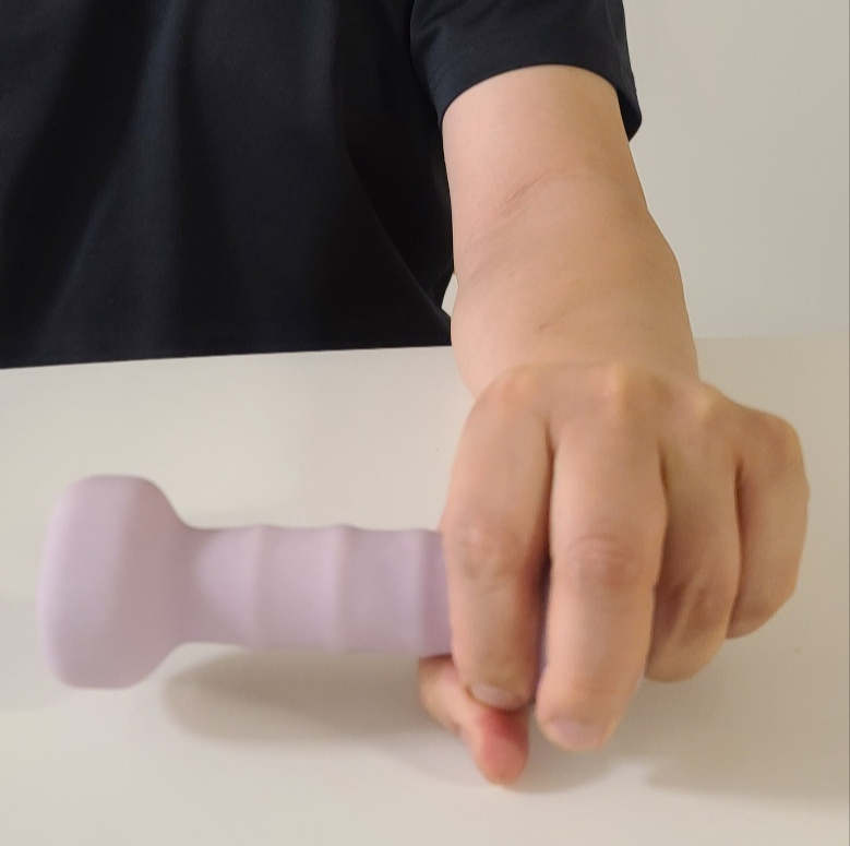 팔꿈치를 살짝 구부린 상태에서 아령의 끝쪽을 잡고 회외, 회내방향으로 천천히 속도를