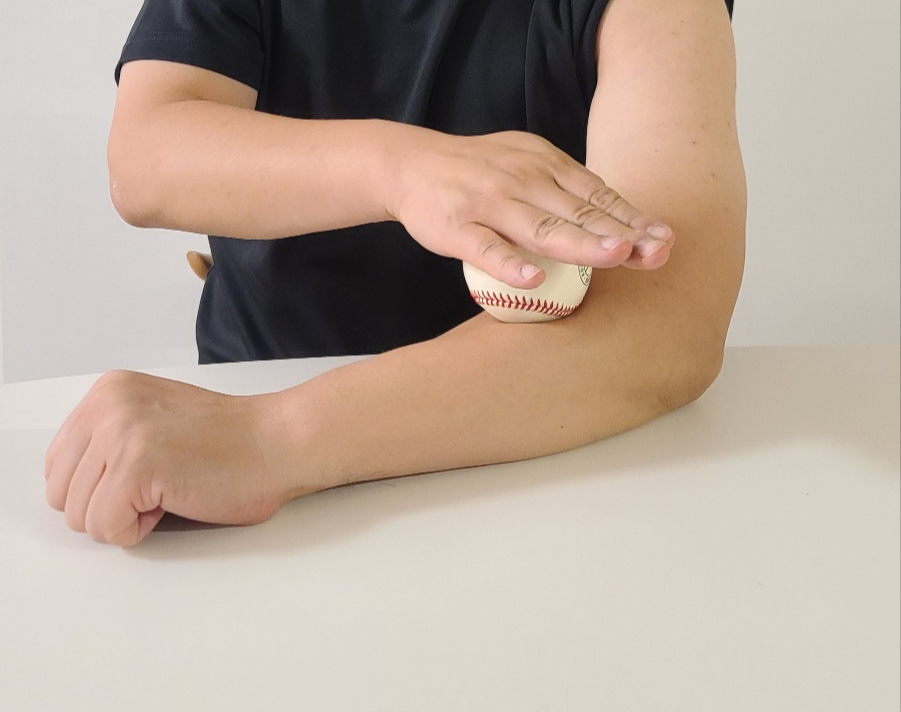 손목굴곡근과 같은 자세에서 팔꿈치와 어깨사이를 공으로 가볍게 누른후 맛사지를