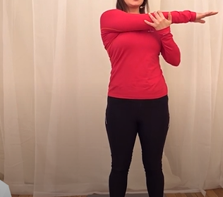 2. 반대팔은 아픈팔의 팔꿈치 부분을 잡고 몸쪽으로 당겨줍니다.