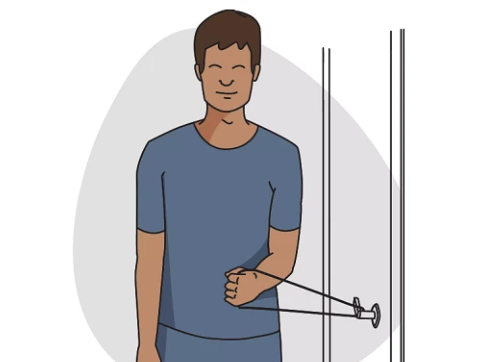 2. 팔꿈치를 90도로 구부린후 몸에 밀착시킨 후 밴드 잡은 손을